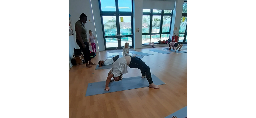 Children and adult helpers practicing tree posture: Vrikasana. Building balance and strength.